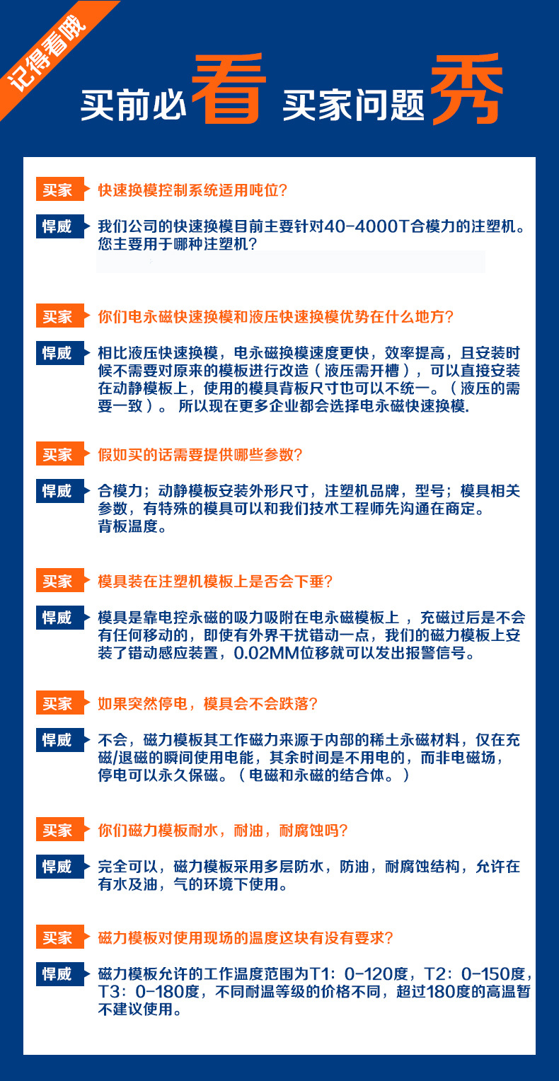 悍威磁電有多年從事電永磁相關產(chǎn)品研制的經(jīng)驗,其電永磁快速換模系統(tǒng)完全按照國際標準設計制造,精益求精,整套系統(tǒng)的性能、質(zhì)量和安全保護裝置毫不遜色于國際知名品牌,適用于50噸—3200噸注塑機使用。