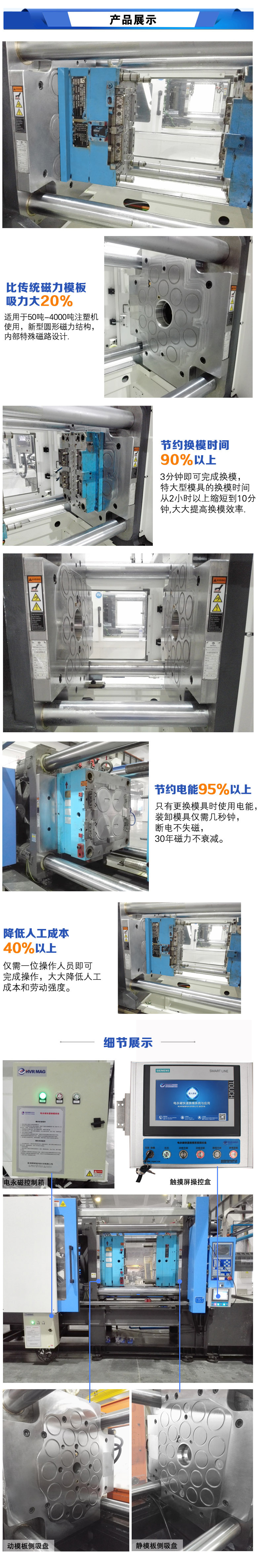 電永磁快速換模系統(tǒng)使模具裝卸時間節(jié)約90%以上,特別適合當(dāng)前“多批少量”的生產(chǎn)模式,大大地提升企業(yè)競爭能力,做到安全、快速、準(zhǔn)時交貨,提高生產(chǎn)效率,避免工傷事故的發(fā)生和模具的碰撞損壞。